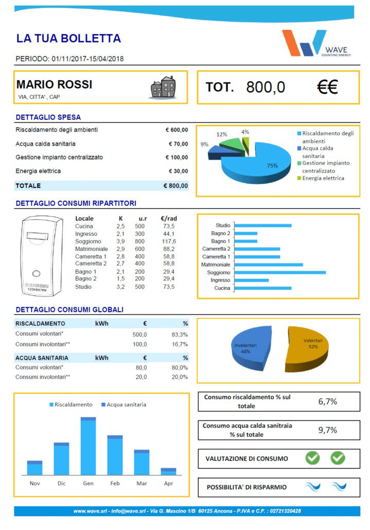 - Monitoraggio globale e dettagliato: Un’analisi completa che include sia i consumi volontari che quelli involontari, suddivisi per riscaldamento e acqua sanitaria.